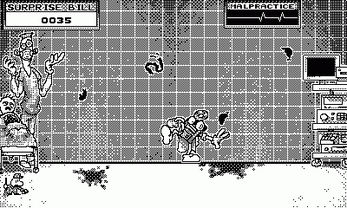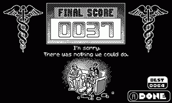 Paging Dr. Floppy is an arcade-style game of skill and timing. As head surgeon, it is Dr. Floppy's job to catch all of the organs bursting from his grateful patients before they hit the ground. Direct Dr. Floppy left and right to nab the organs as they fly! As you successfully make catches, his patient's bill increases and lines the good doctor's pockets. Drop three organs and Dr. Floppy loses everything: his job, his standing, even his kids. His fate is in your hands.